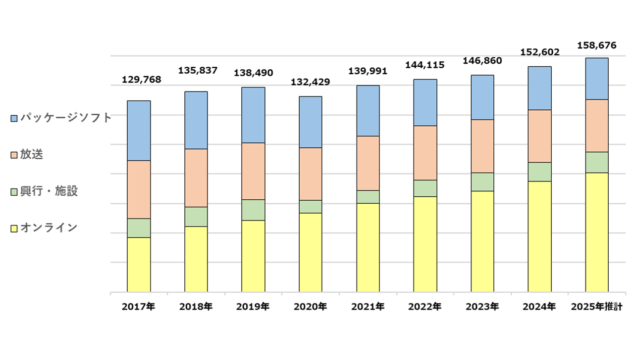 分野別には、2024年に減少となった映画館が拡大して過去最高値を記録。同じく2024年に減少した家庭用ゲームも拡大した。映像・音楽配信等のオンラインコンテンツとオンライン広告が拡大を継続、その合計は市場の過半を超えた。