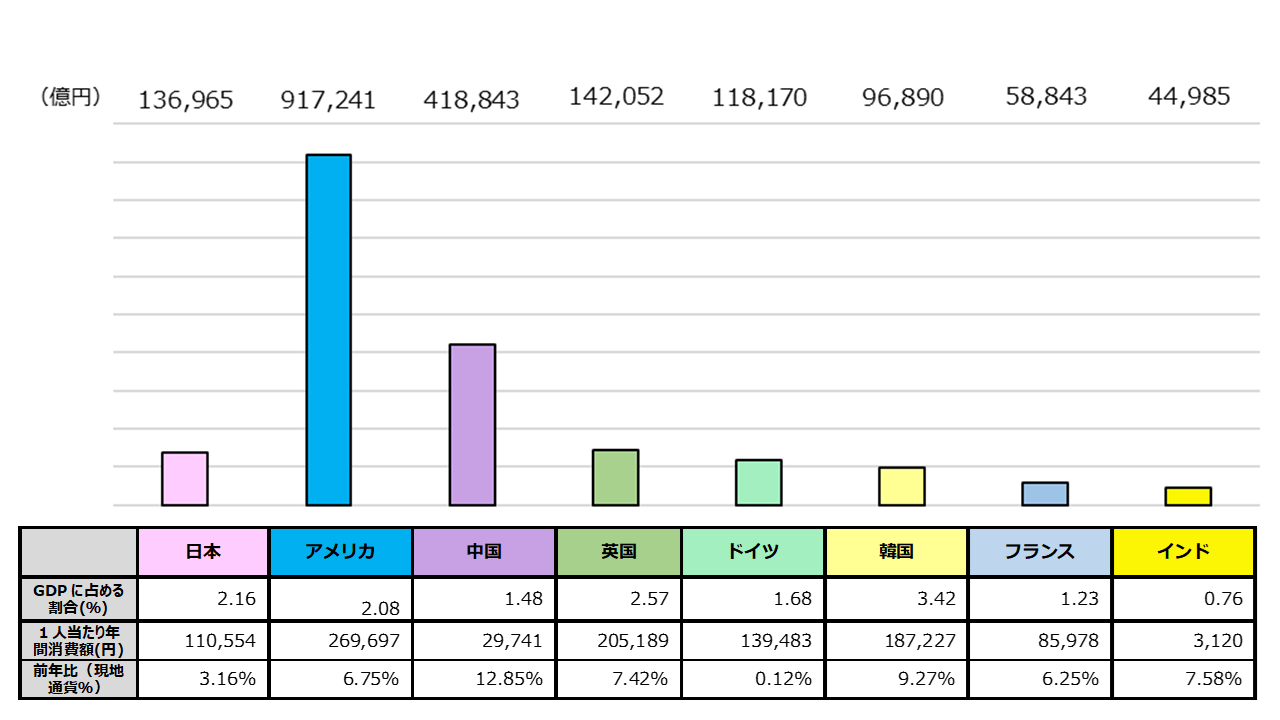 ◆世界の主要8か国・地域のうち、米国が最大となり円建てでは日本の7倍の90兆円超、 2位の中国はアメリカの半分弱の40兆円超の規模。続いてイギリスが14兆円超。