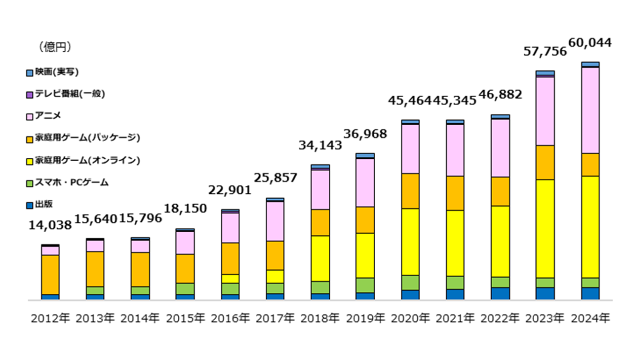 前年比は2023年の23.2%に及ばず4%に留まった。大幅な円安による年平均通貨下落率の7.7%よりも小さく、ドル建てでは縮小したことになる。 海外から日本への収入は約3.4兆円だった。算出した分野は映画(実写)、テレビ番組(一般)、アニメ(劇場・放送・配信等の映像と商品化ライセンス含む)、家庭用ゲーム(ソフト販売/オンライン)、スマホ・PCゲーム、出版(マンガを主とする)。アニメの海外売上が前年比26%の大幅増の約2.2兆円、他の分野は微増、横ばい、微減となり、アニメが全体の拡大を支えた。